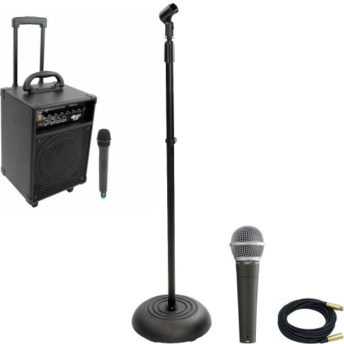 Pyle Speaker, Mic, Stand and Cable System Package for your Studio, Concert, Stage, Performance, Bar, Home, etc. - PWMA230 200W VHF Wireless Battery Powered PA System - PDMIC58 Professional Moving Coil Dynamic Handheld Microphone - PMKS5 Compact Base Black Microphone Stand - PPMCL30 30ft. Symmetric Microphone Cable XLR Female to XLR Male Feature